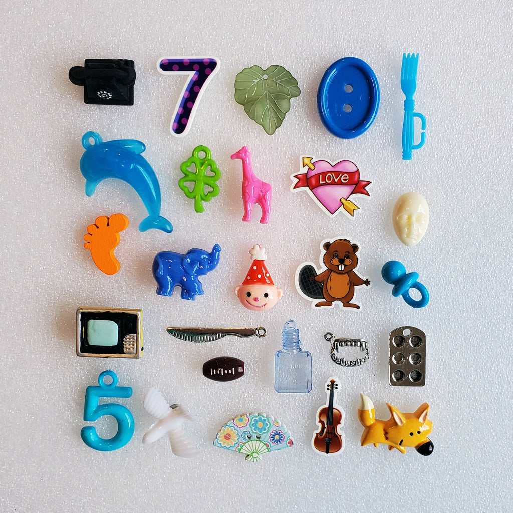 ~ Each set focuses on beginning, medial and final letter positions. Each is 1/2” to 2” in size with one or two being larger (a zipper bracelet, necklace, etc.). We DO NOT add ordinary round sewing buttons, erasers, or beads as fillers! All objects are meant to be meaningful in working with speech therapy.